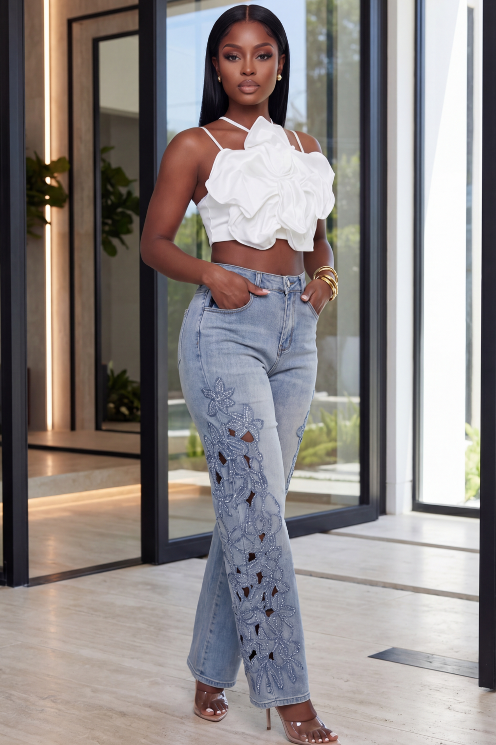 Bloom Detail Denim Jeans [Light Wash]
