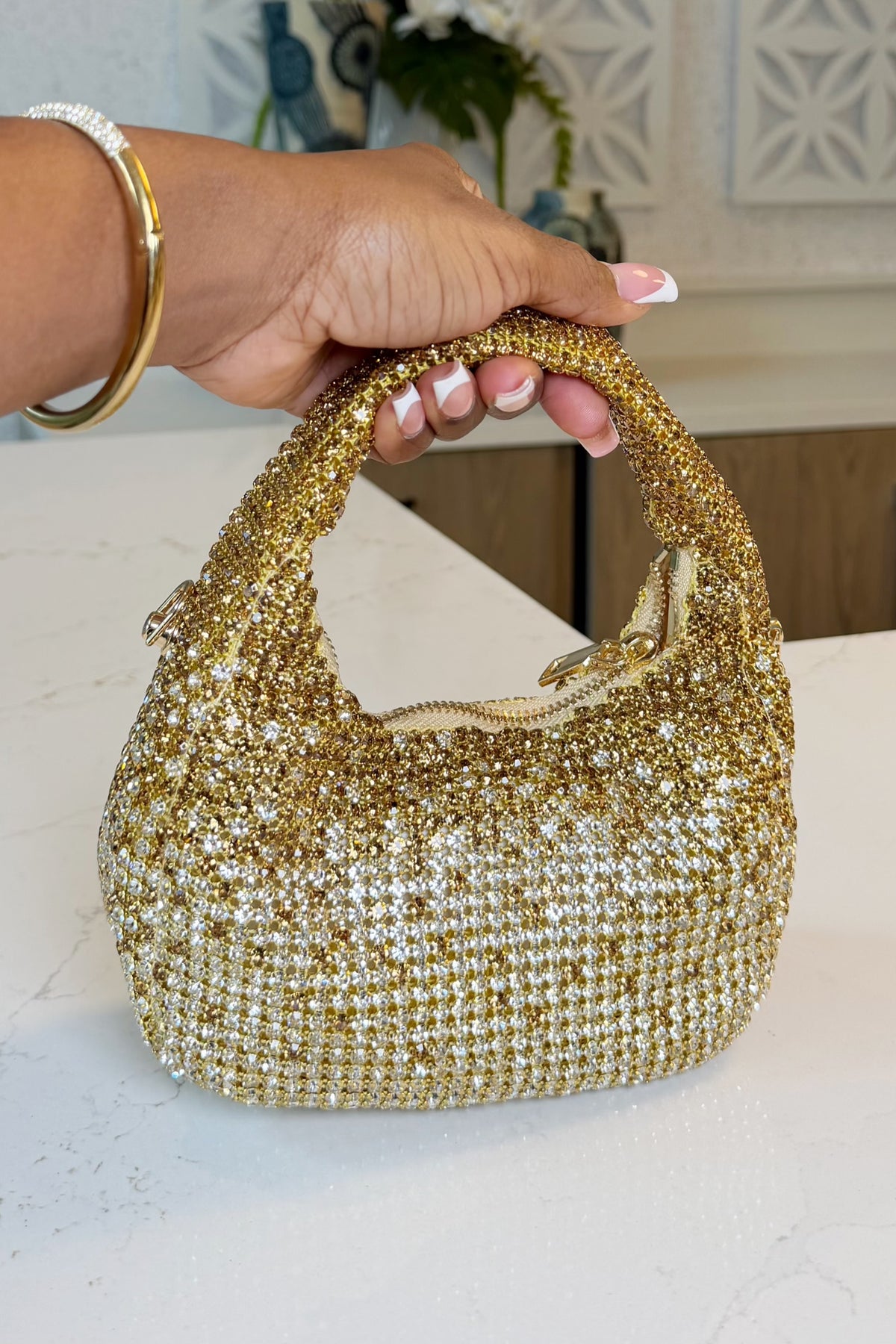A luxe statement mini bag drenched in shimmering crystals, perfect for elevating evening looks and special occasions.