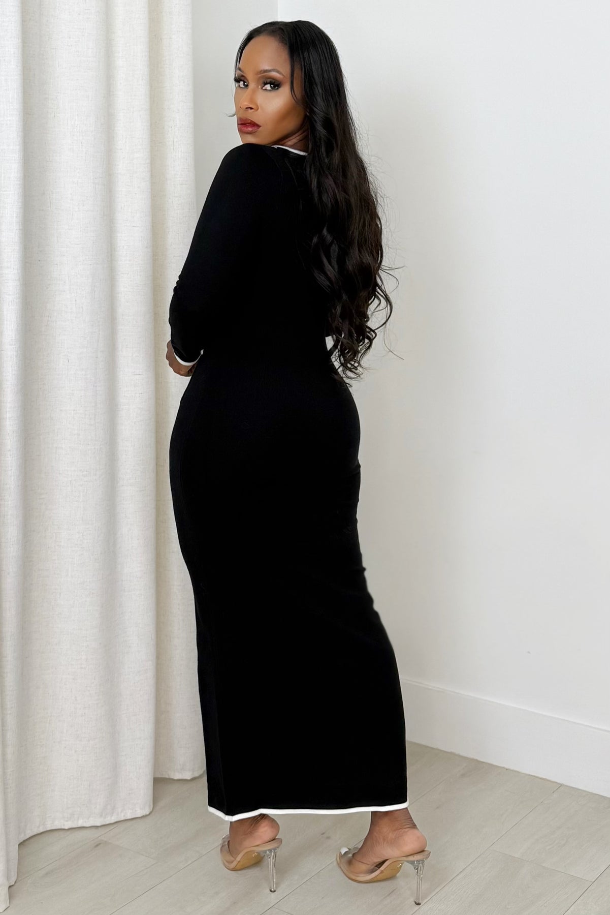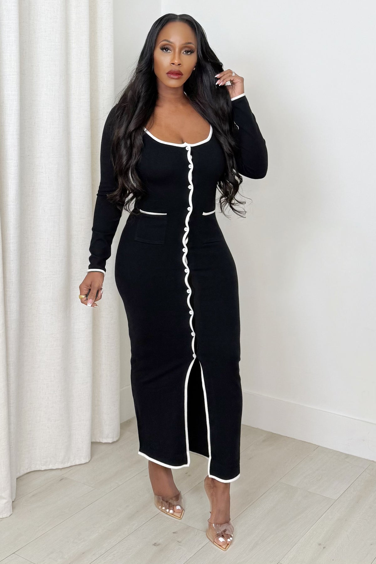 Meet the Monochrome Muse Midi — a refined, body-sculpting knit dress that blends simplicity with striking contrast. Detailed with white piping, a curved button-down front, and a subtle front slit, this piece brings an elevated touch to everyday chic. Soft, stretchy, and undeniably polished, it’s perfect for workdays, dinner dates, and cool-weather outings where elegance is the assignment.