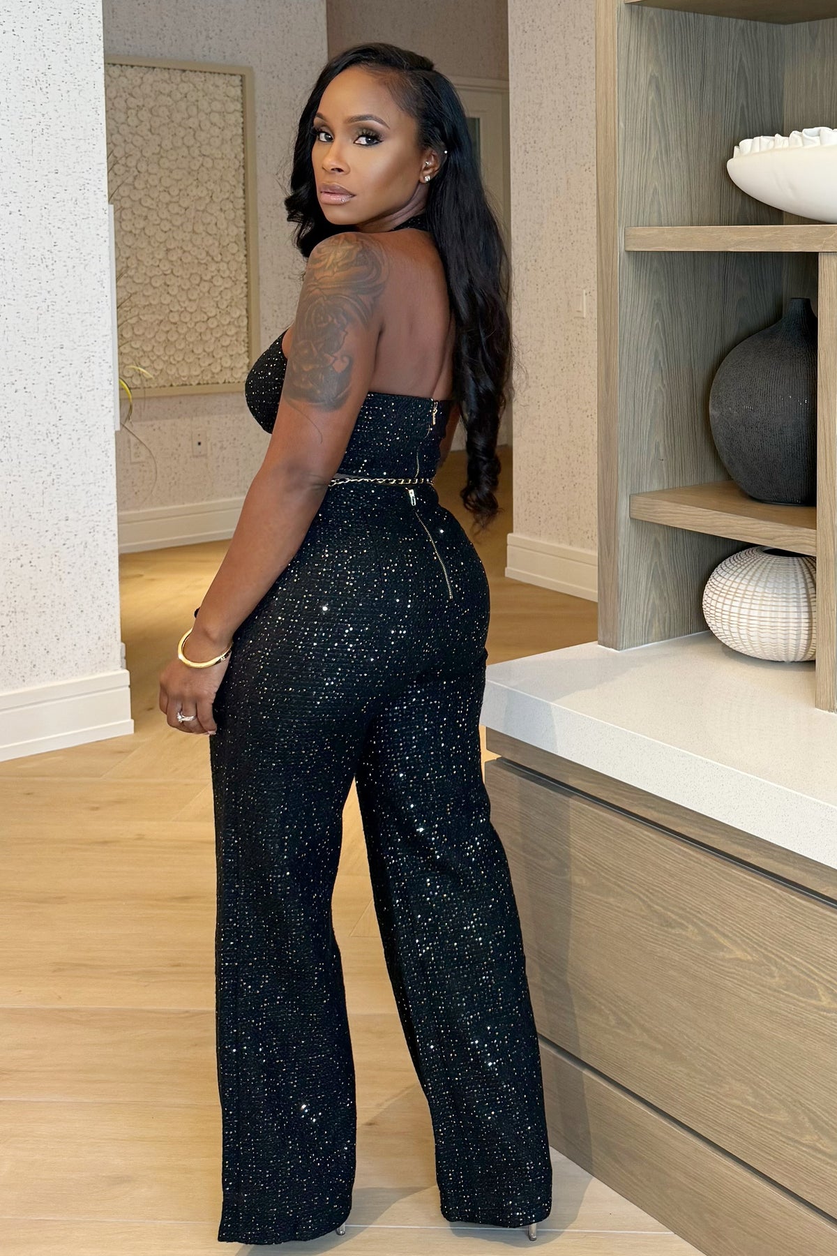 A chic tweed two-piece that blends structure with allure. Designed with a halter neckline and floral rosette detail, keyhole front, and tailored high-waist pants — finished with a hint of sparkle throughout for a polished, luxe feel.