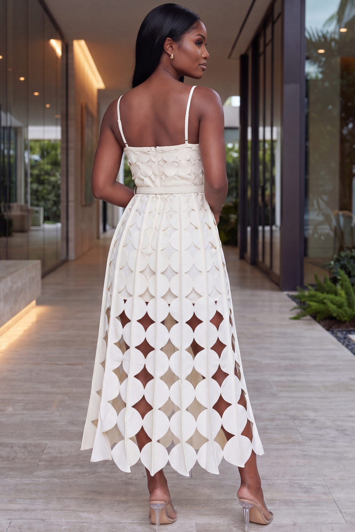 Architecture meets artistry in a dress designed to captivate.Command the room in the Seraphina Midi, a masterclass in modern elegance. Featuring a striking geometric laser-cut motif, this dress plays with light and shadow to create a silhouette that is both ethereal and bold. It’s the ultimate statement piece for the woman who demands a look that is as structured as it is graceful.