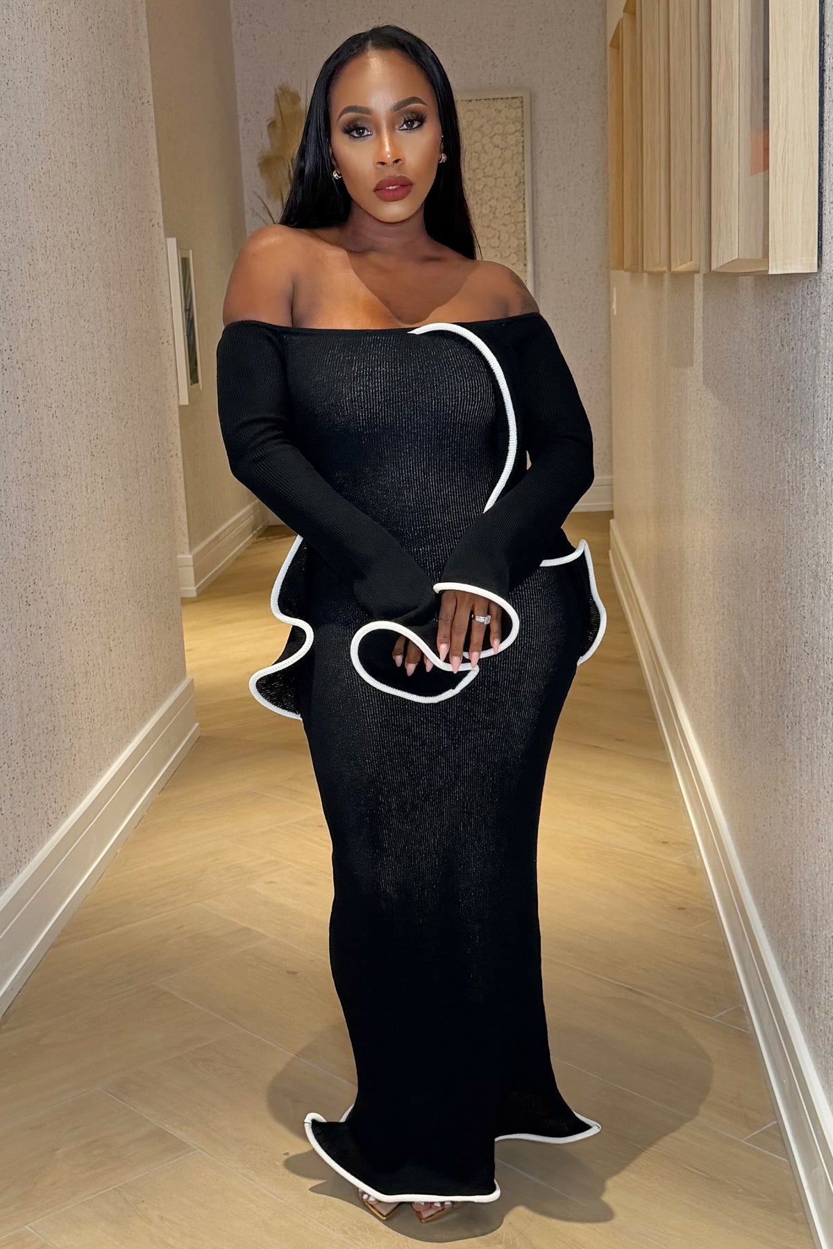 Bold, feminine, and undeniably elegant. This off-the-shoulder knit dress features sculpted ruffle detailing with contrast trim, creating a striking silhouette that hugs in all the right places. Designed to make a statement while keeping it timeless and refined.
