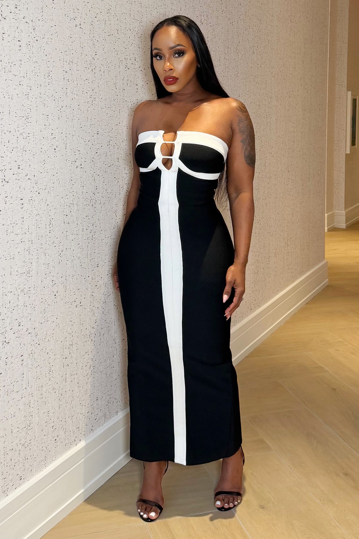 Graceful with a subtle edge, this strapless midi dress is designed to flatter and elongate the silhouette. Featuring soft contrast detailing and a sleek, body-skimming fit, it’s the perfect balance of modern elegance and understated allure.