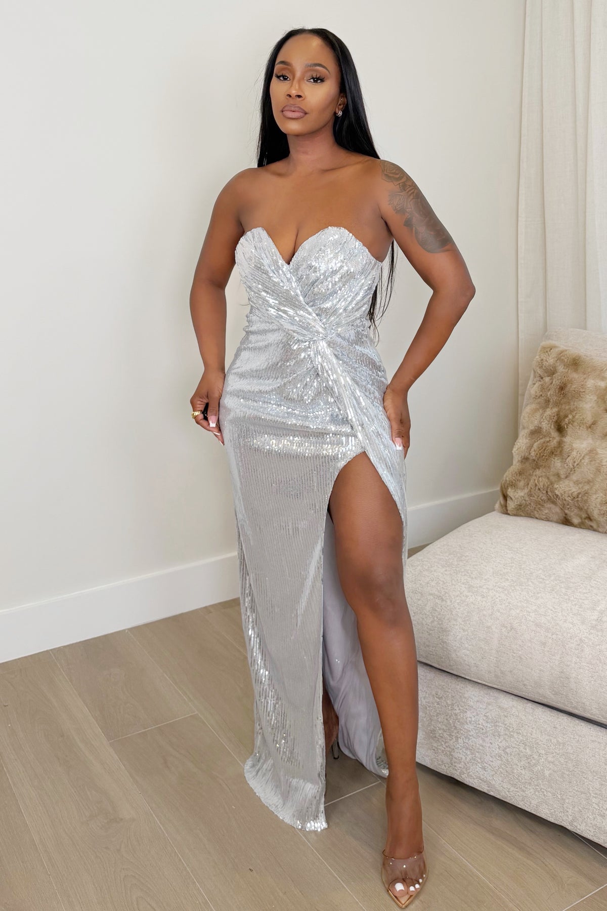 The Starlight Drape Gown is designed to command the room. Crafted in shimmering silver sequins, this strapless silhouette features a softly draped bodice that cinches at the waist and flows into a sultry high slit. Elegant yet undeniably bold, it’s the ultimate statement piece for evening events, celebrations, and unforgettable entrances.