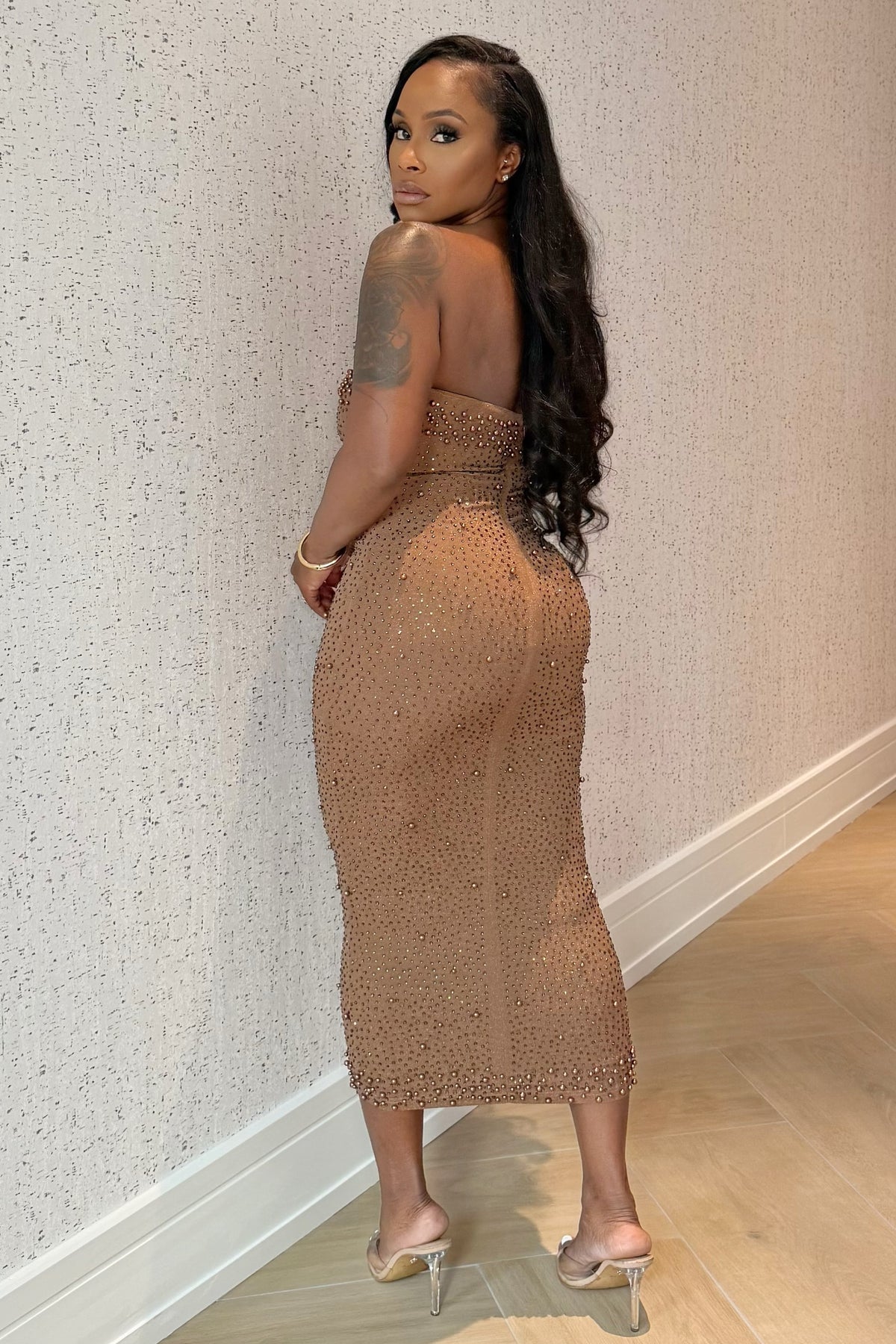 A true statement of sophistication — this strapless beaded midi hugs every curve with elegance and sparkle, creating a sleek, feminine silhouette perfect for upscale events or celebrations.
