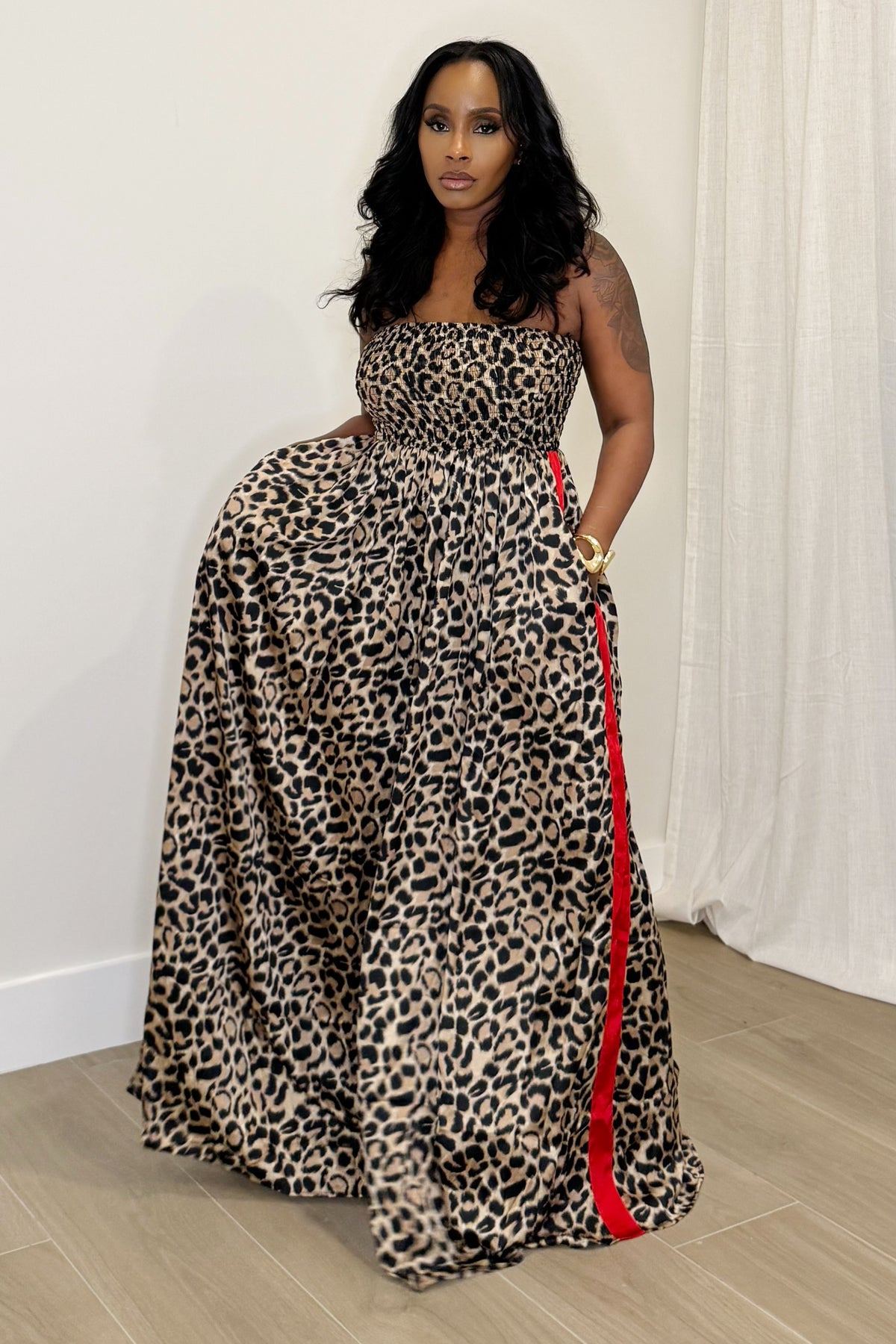 Effortlessly exude untamed chic in this leopard print tube jumpsuit. Featuring a scrunched wide leg design and luxurious silk material, this jumpsuit will make you stand out in style. Get ready to turn heads and unleash your wild side with this must-have piece!