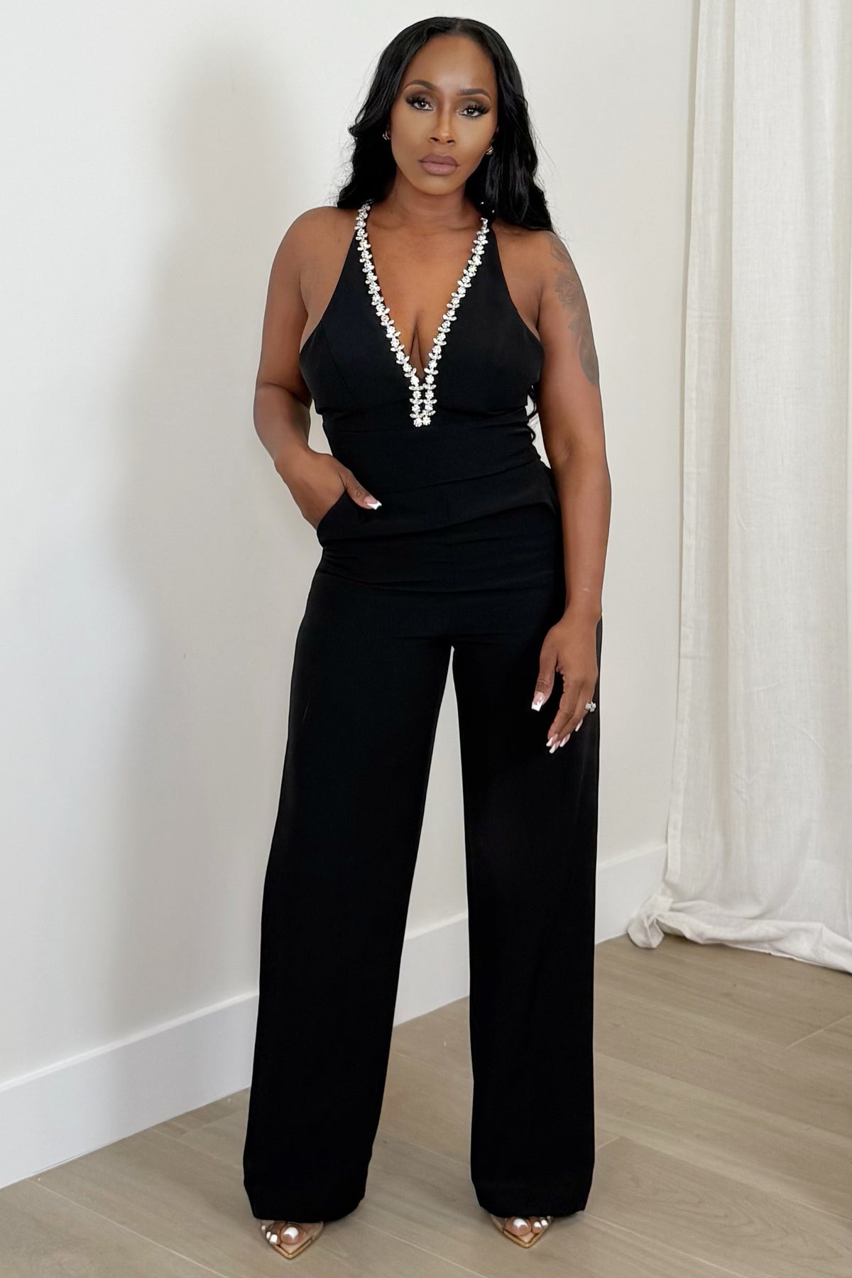 Elegant, sleek, and effortlessly statement-making — this wide-leg jumpsuit features a crystal-trimmed plunge neckline that adds just the right amount of sparkle. The silhouette snatches the waist while keeping you comfortable and polished for any evening event.