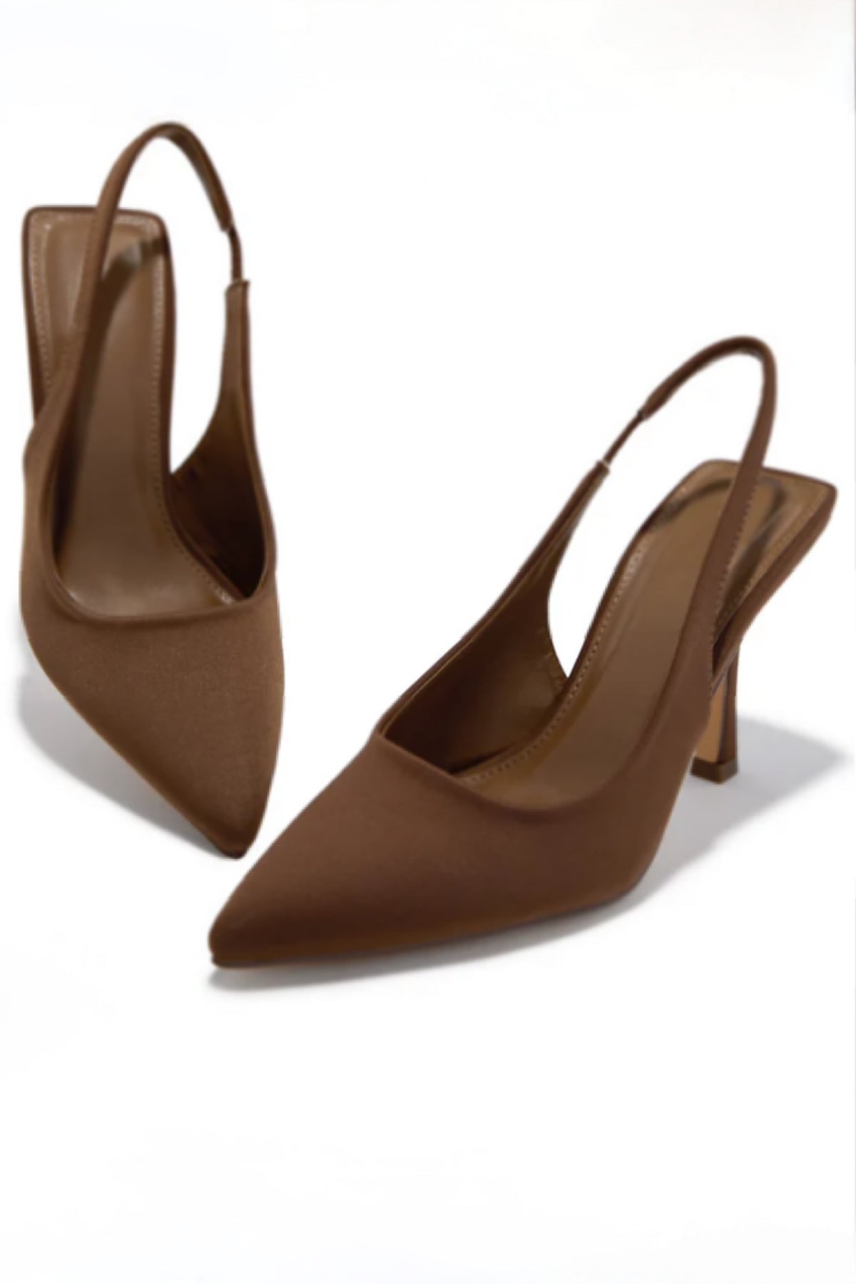 Elegant, versatile, and endlessly chic. These brown-toned slingback heels feature a sleek pointed toe, slim heel, and satin finish that adds a luxe touch to any outfit. The perfect neutral to carry you from day to night.