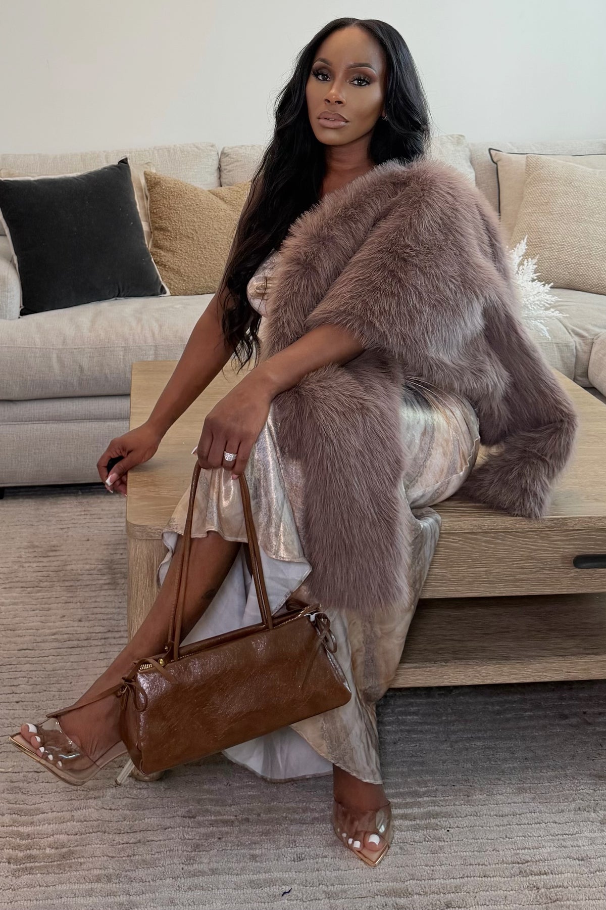 Effortless elegance meets soft shimmer in the Golden Marble Slip Gown. Designed with a fluid draped neckline and a marble-swirl metallic finish, this silhouette glides beautifully with each step. Delicate straps and a body-skimming cut create a look that’s refined, feminine, and enchanting from every angle.