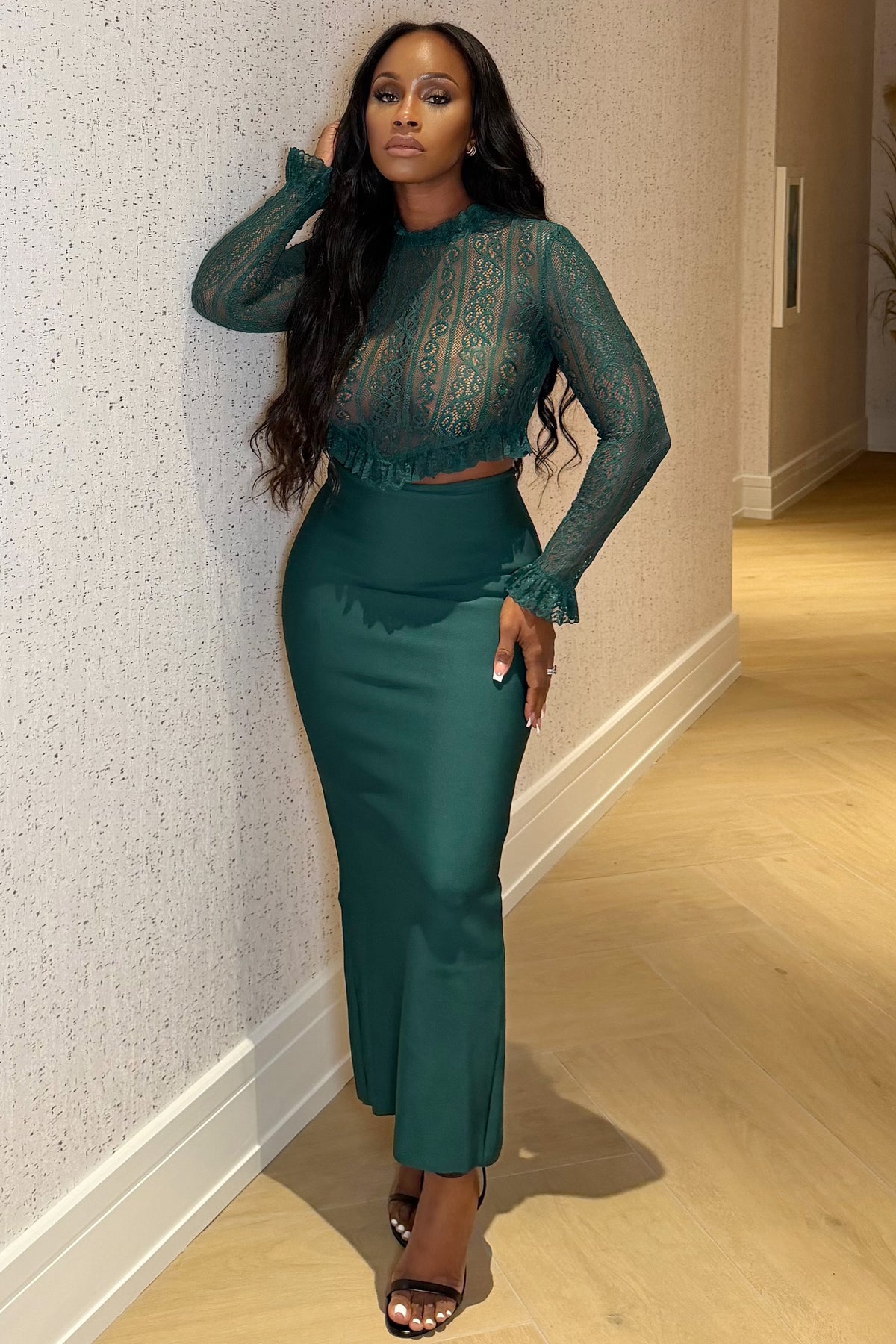 The Emerald Whispers Set blends romance and refinement with its sheer lace mock-neck top and sleek high-waisted satin skirt. The cropped lace silhouette adds a soft, feminine touch while the fitted midi skirt sculpts the body with a smooth, elegant finish. Together, they create a look that’s timeless, chic, and beautifully elevated — perfect for evenings that call for luxury.