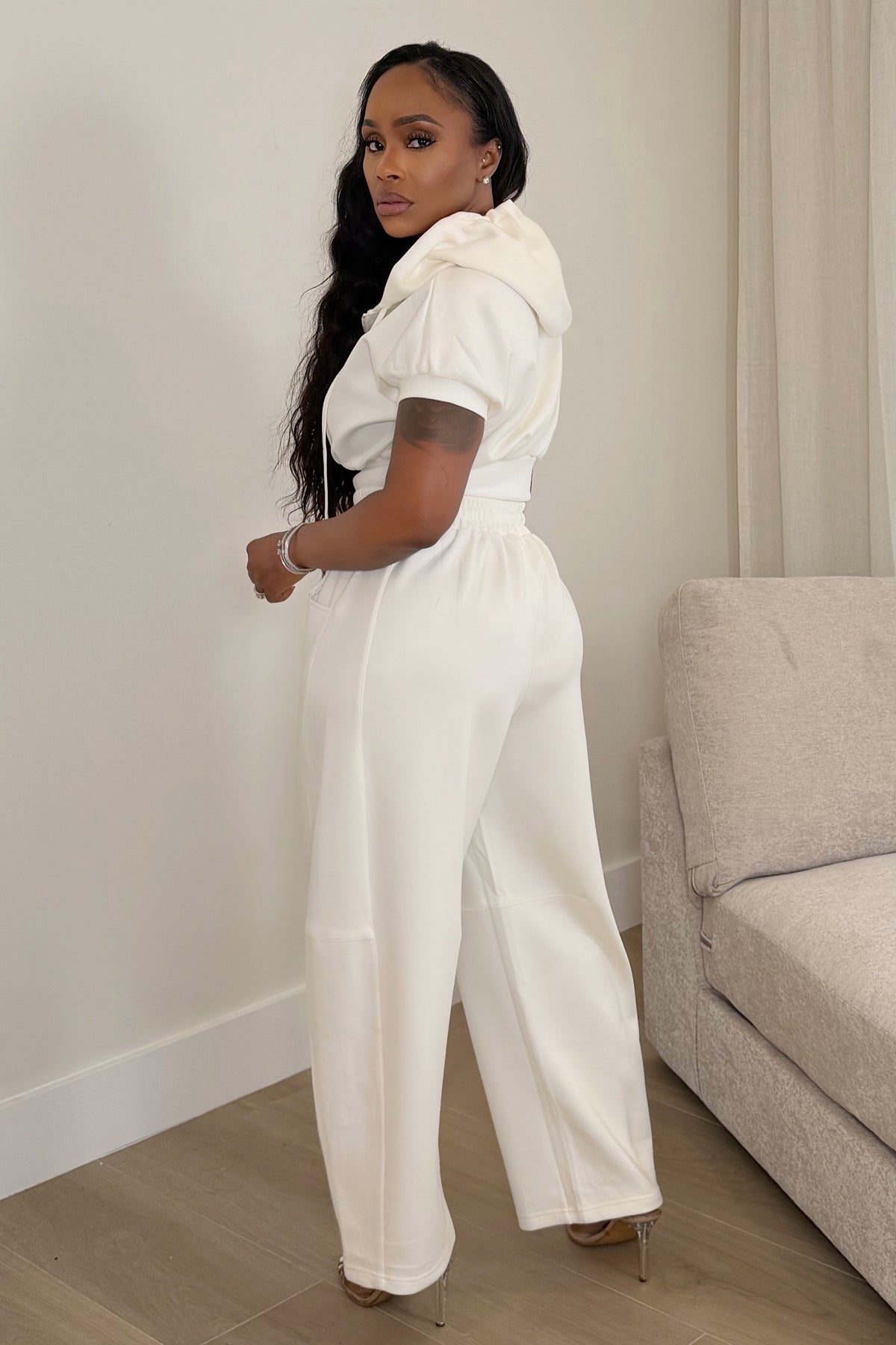 Your elevated everyday set that blends comfort with a clean, chic finish. This ivory two-piece features a cropped zip-front hoodie with short sleeves and a relaxed hood, paired with high-waisted wide-leg pants. Effortless, flattering, and perfect for running errands, casual days out, or styled up with heels for an off-duty luxe look.