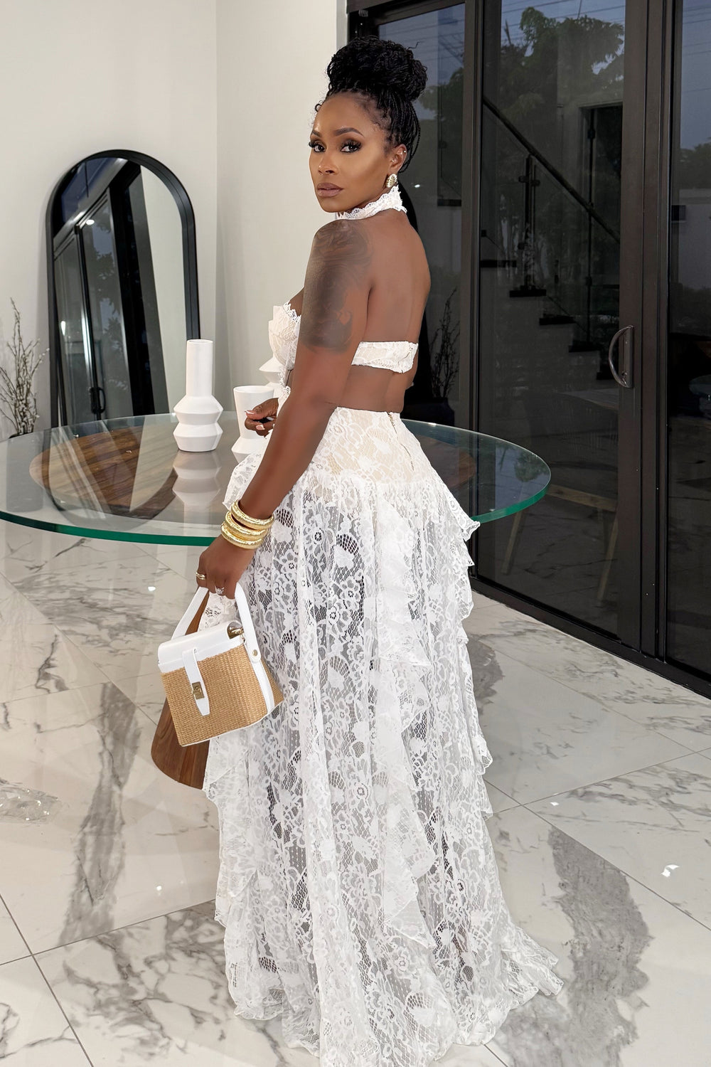 Elevate your elegance with the Make A Statement Lace Maxi Dress in Ivory. Featuring a button closure around the neck and a padded built-in bra for comfortable support, this dress highlights your silhouette with cut sides and a delicate lace and ruffle design. The back zipper closure ensures a perfect fit, making it ideal for special occasions where you want to leave a lasting impression.