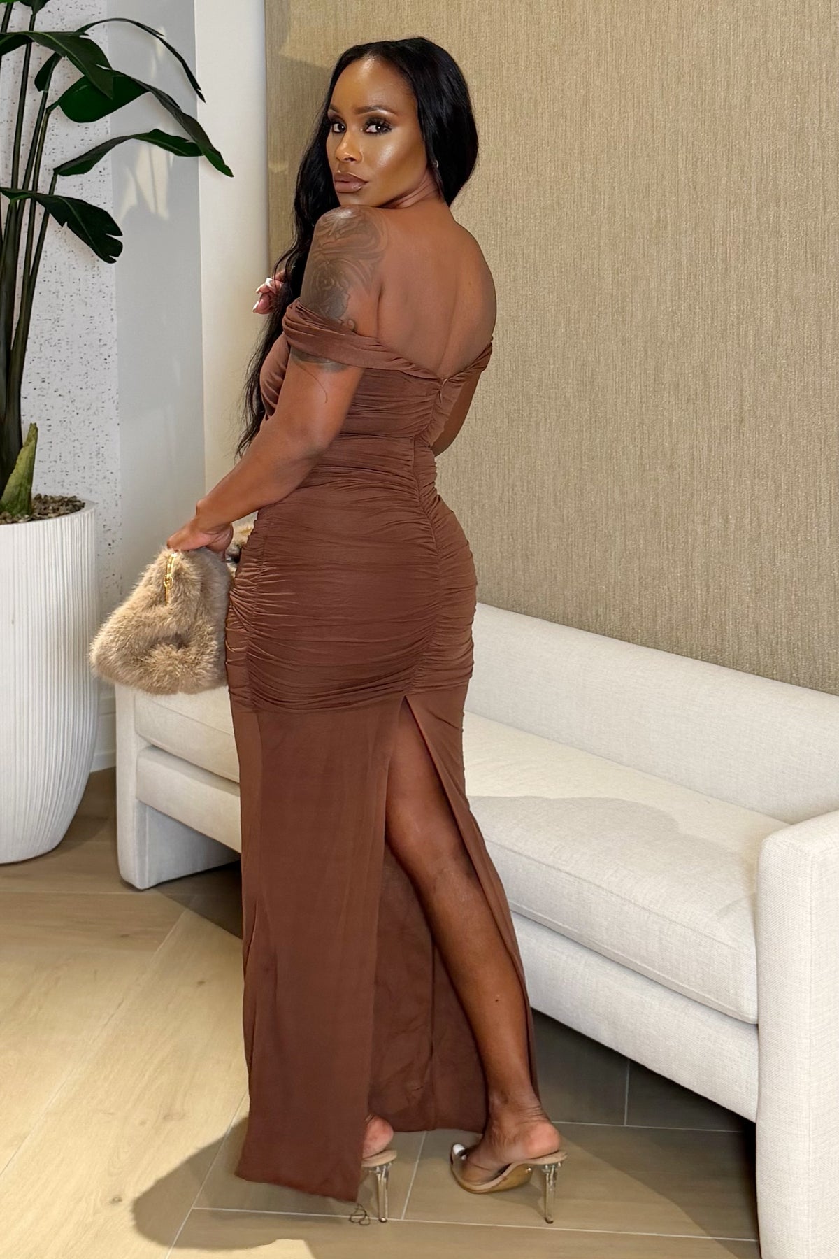 A bold, captivating moment in the dreamiest shade of mocha. This off-shoulder gown features a sculpting ruched design that hugs every curve with elegance. The twisted bust detail and front peekaboo cutout add a touch of drama—perfect for nights when you want to be unforgettable without saying a word.