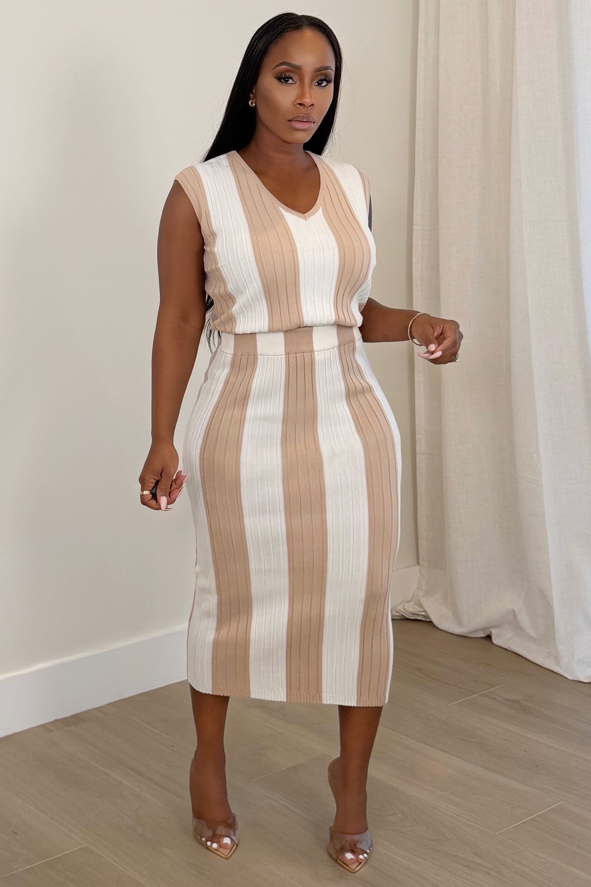 Effortlessly polished with a soft, modern edge, the Neutral Muse Knit Midi Set is the definition of refined comfort. Designed in a ribbed stretch knit with vertical taupe and ivory striping, this two-piece set features a sleeveless V-neck top paired with a high-waisted, body-contouring midi skirt that hugs your curves in all the right places. The vertical pattern elongates the silhouette while the neutral color palette keeps the look timeless and versatile. Perfect for brunch, casual meetings, vacation styling, or dressed up with heels for an elevated everyday moment, this set blends sophistication with ease.