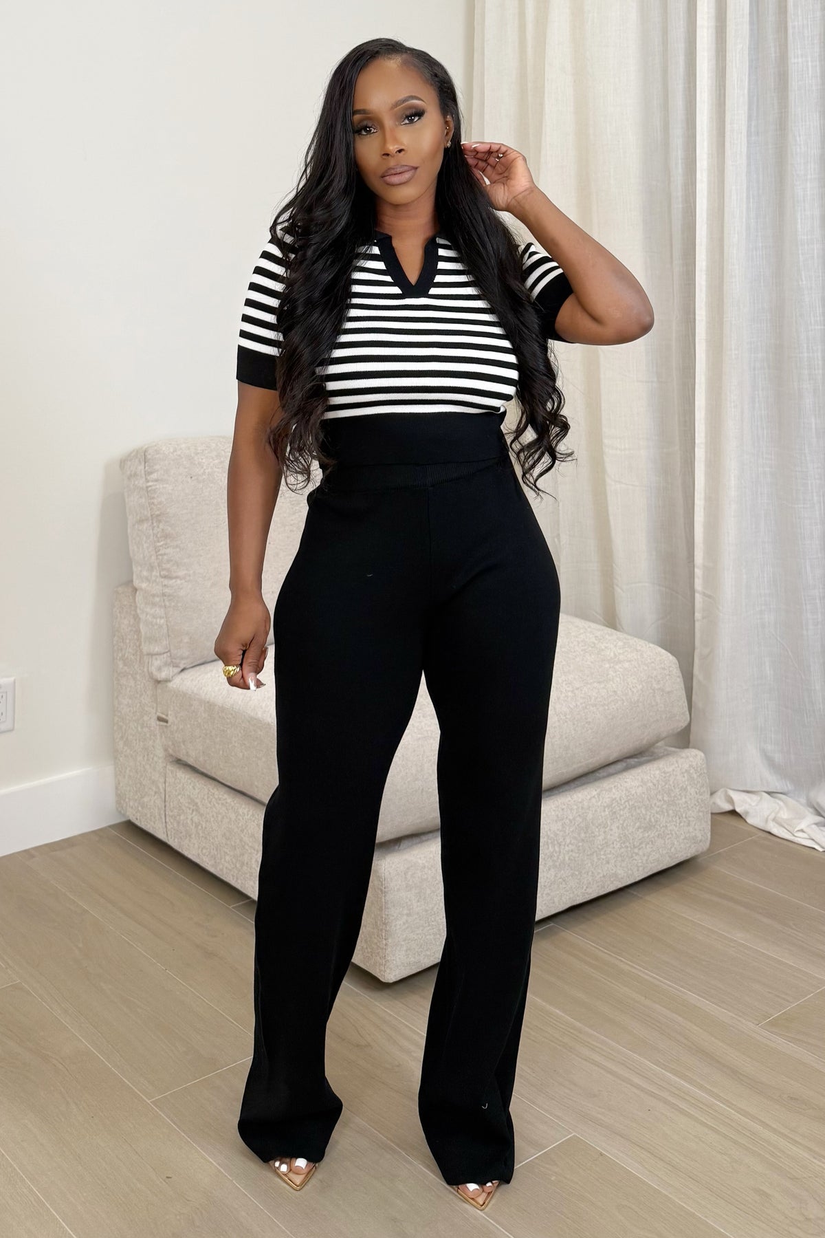 Discover effortless style with The Paris Edit Pant Set! Made with amazing stretch knit fabric, this black and white set will elevate your wardrobe. Feel confident and comfortable all day long while looking chic and sophisticated. Perfect for any occasion, this pant set is a must-have for any fashion-forward individual.